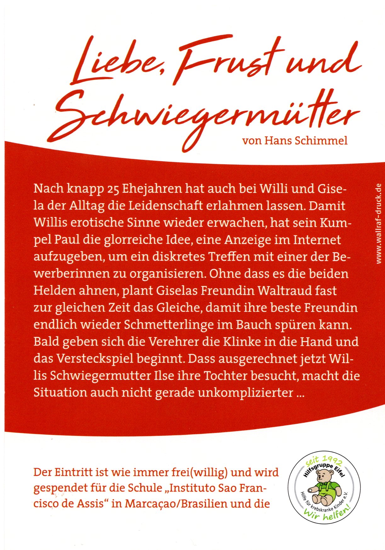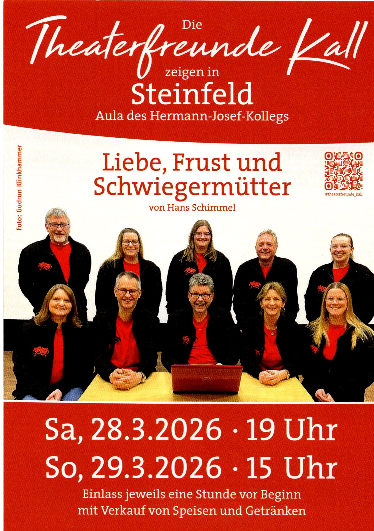 Am Palmsonntag-Wochenende spielen die Theaterfreunde Kall wieder in unserer Aula am HJK. Diesmal nehmen die Schauspieler die Dating-Möglichkeiten mit Hilfe des Computers auf’s Korn in ihrer Präsentation des Stückes “Liebe, Frust und Schwiegermütter” von Hans Schimmel. Am Samstag 28.3. geht es um 19 Uhr los, am Sonntag 29.3. nachmittags um 15 Uhr. Einlass jeweils eine Stunde vor Beginn mit Verkauf von Speisen und Getränken. Der Eintritt ist frei(willig) und für einen guten Zweck.