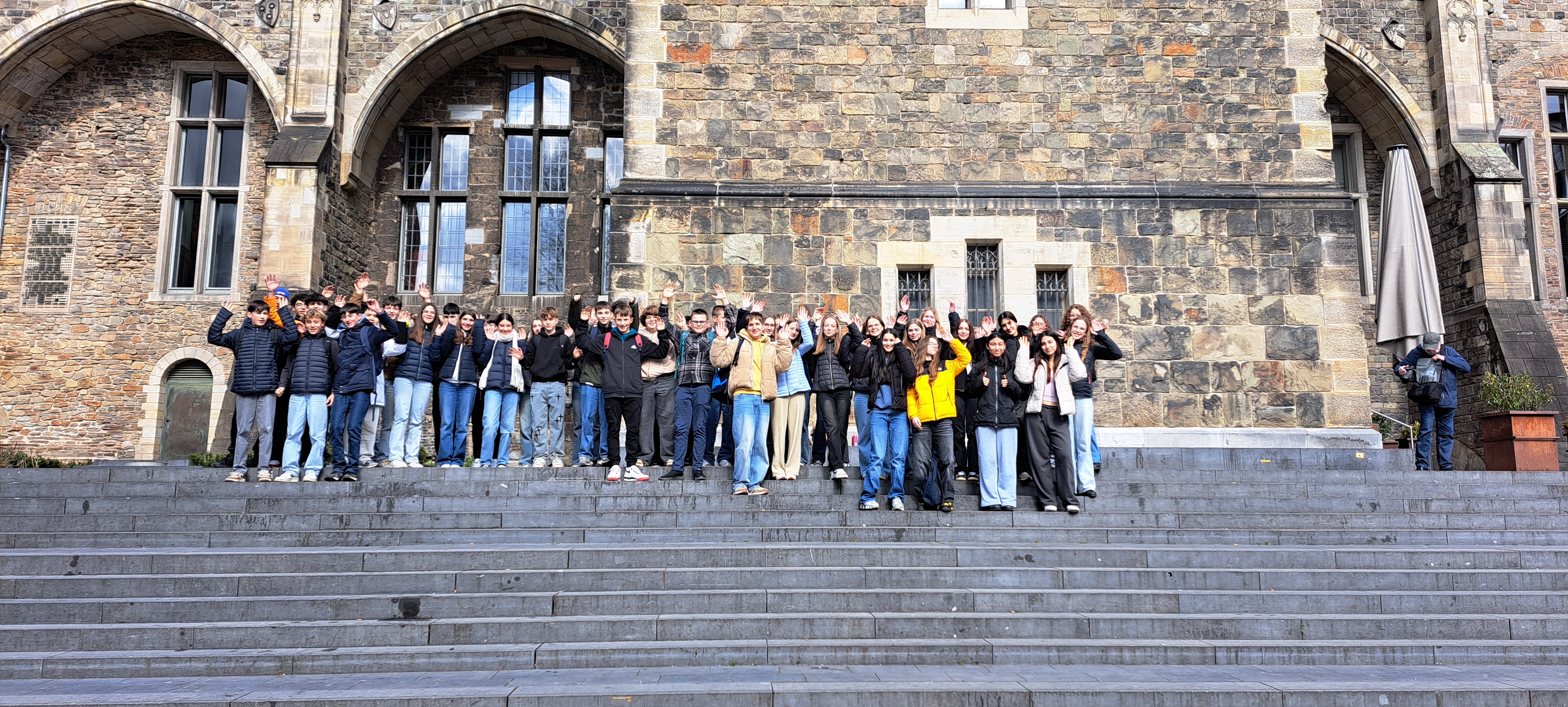 Am nächs­ten Mor­gen sind wir um 8:00 Uhr mit dem Bus nach Aachen los­ge­fah­ren und hat­ten dort eine getrenn­te Füh­rung im Cent­re Char­le­ma­gne. Danach konn­ten wir die freie Zeit mit unse­ren Austauschschüler:innen in der Innen­stadt genie­ßen. Am Nach­mit­tag konn­ten wir uns im Super­fly in Aachen noch ein­mal aus­to­ben. Um 16:30 Uhr ging es für uns zurück nach Stein­feld, von wo wir mit unse­ren Fami­li­en nach Hau­se fuh­ren und den rest­li­chen Abend frei hat­ten.