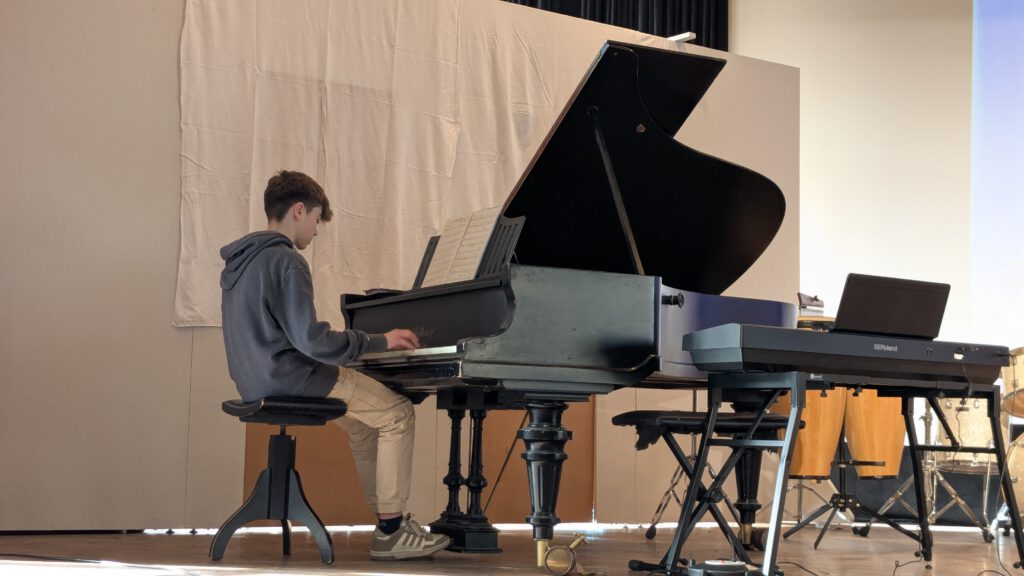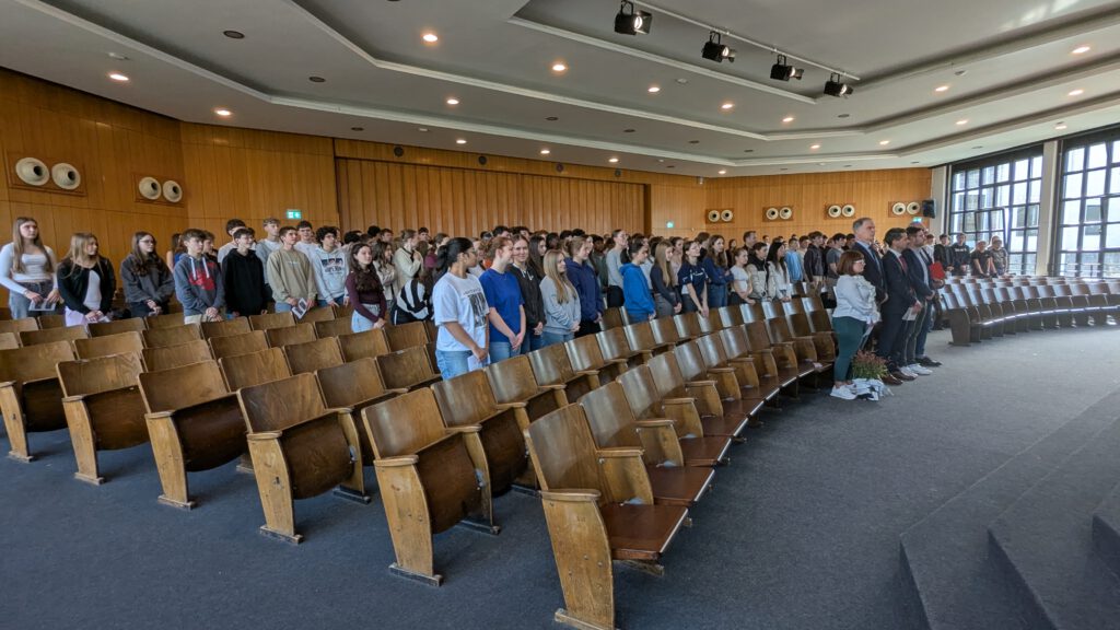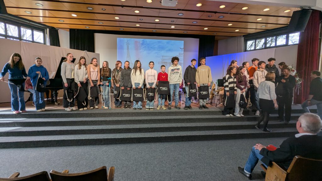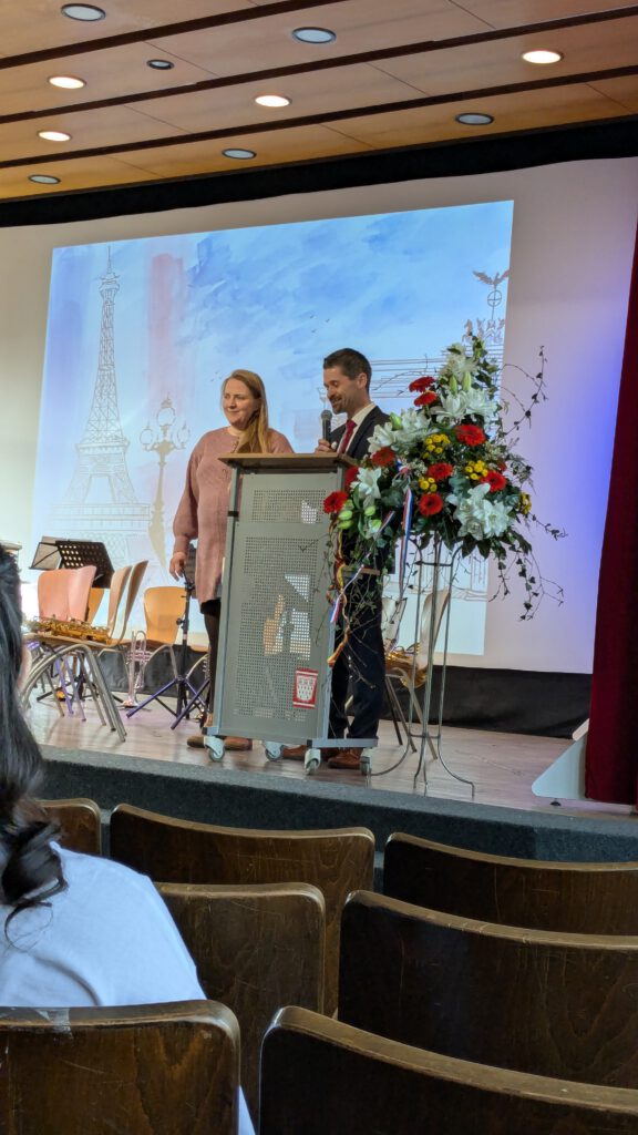 Natürlich gab es musikalisches Rahmenprogramm inclusive der beiden Nationalhymnen, die stehend mitgesungen wurden. Eine Bearbeitung der Europahymne spiegelte den größeren Rahmen. Außer dem Orchester unter Leitung von Frau Rothkopf spielte Samuel Gerhards am Klavier zwei kleine Walzerimprovisationen. Im Anschluss konnten alle noch im Foyer der Aula einen kleinen Imbis genießen, der gerne geteilt wurde. Herzlichen Dank allen, die in der Vorbereitung und Durchführung dieser Jubiläumsfeier mitgearbeitet haben, besonders der Fachschaft Französisch des HJK.