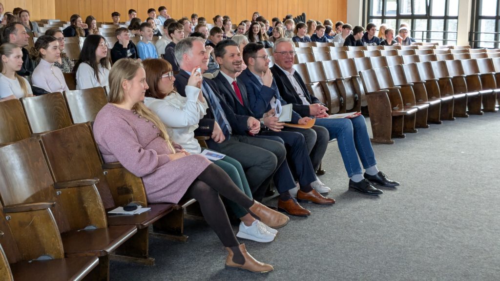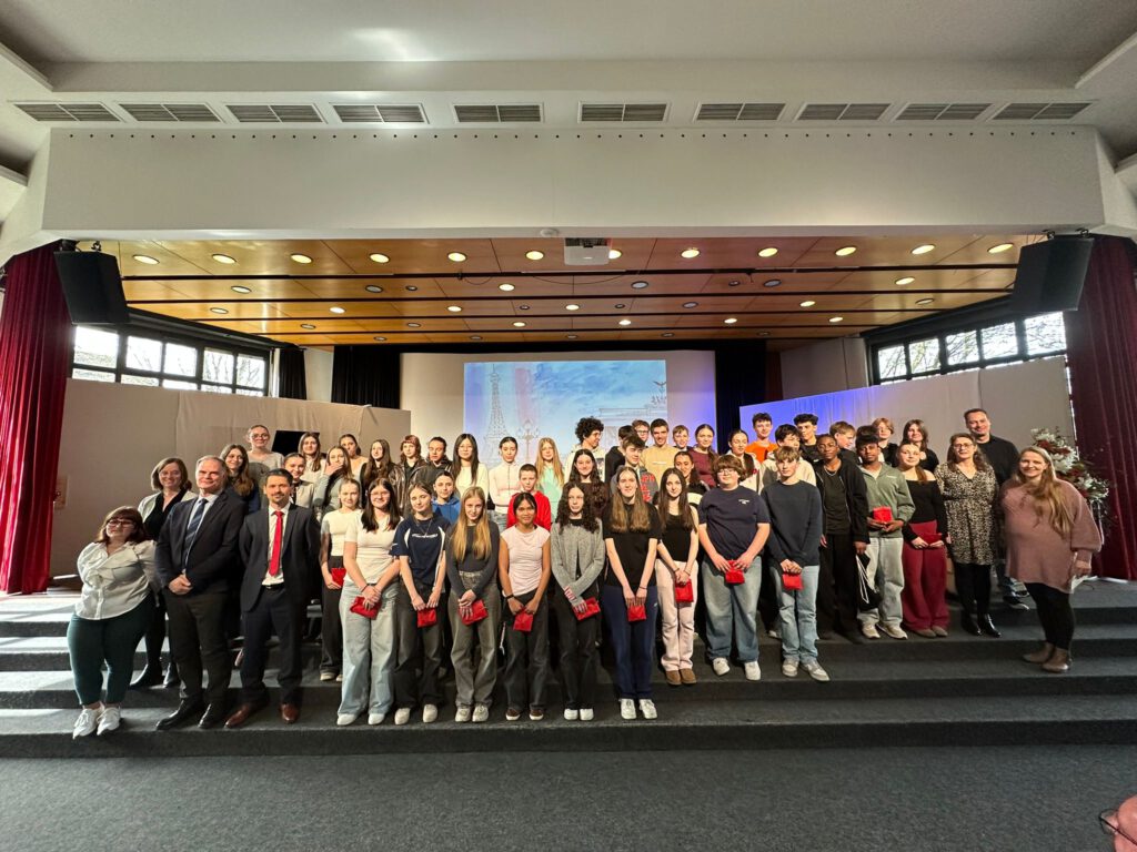 Mit allen Schüler:innen der Klassen 8 und 9, ihren französischen Austauschschülern und einigen Gästen wurde am Freitag die lange gute Partnerschaft zwischen den beiden Schulen in Zillisheim im Elsass und Steinfeld gefeiert. Mit Stolz und Freude sprachen die beiden Schulleiter Vincent Chevalier und Thomas Frauenkron von dieser Kooperation über dreißig Jahre. Sie wünschten eine Fortsetzung für mindesten dreißig Jahre oder gar für unbegrenzte Zeit. Auf jeden Fall soll die Freundschaft wachsen wie das Bäumchen, das die französischen Kollegen als Präsent mitgebracht hatten. Auch Emanuel Kunz, Bürgermeister von Kall, grüßte den Besuch aus Frankreich, der die Tradition des Austauschs unter den befreundeten Ländern fortführt.