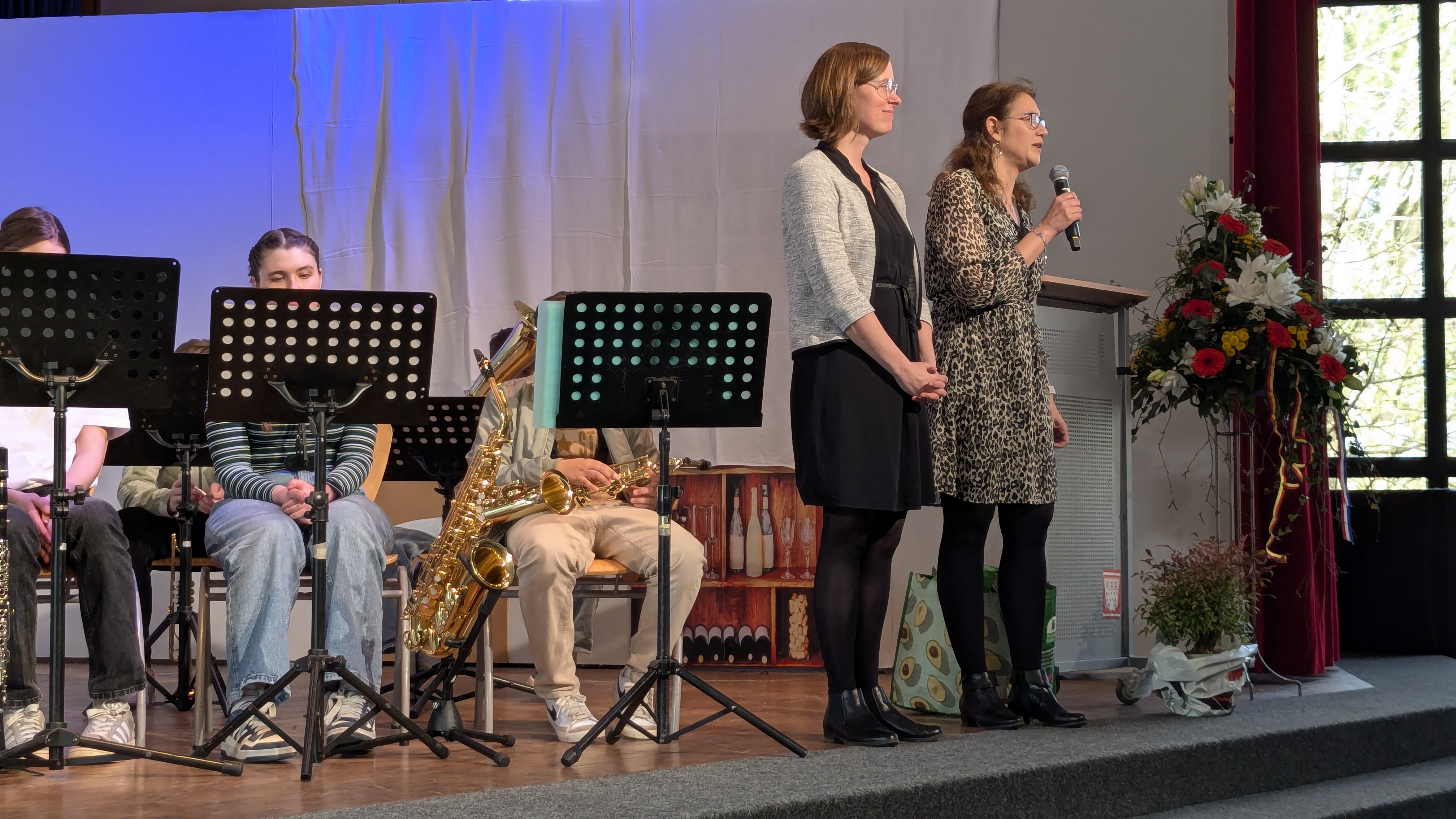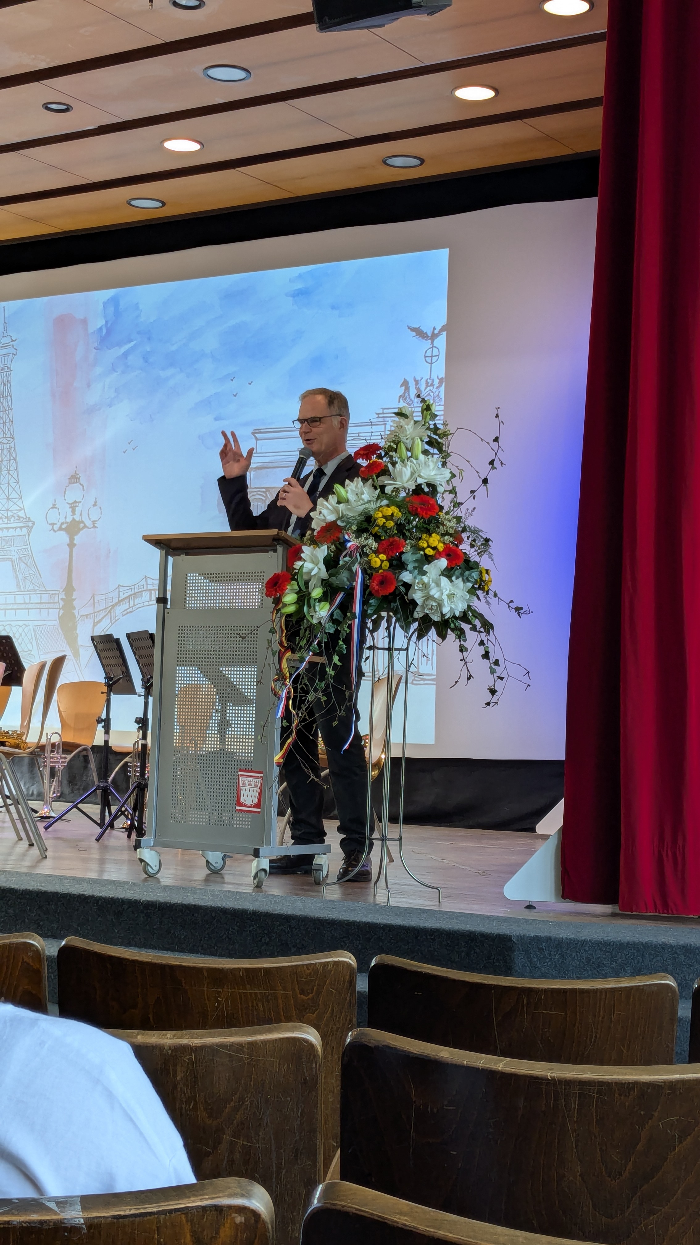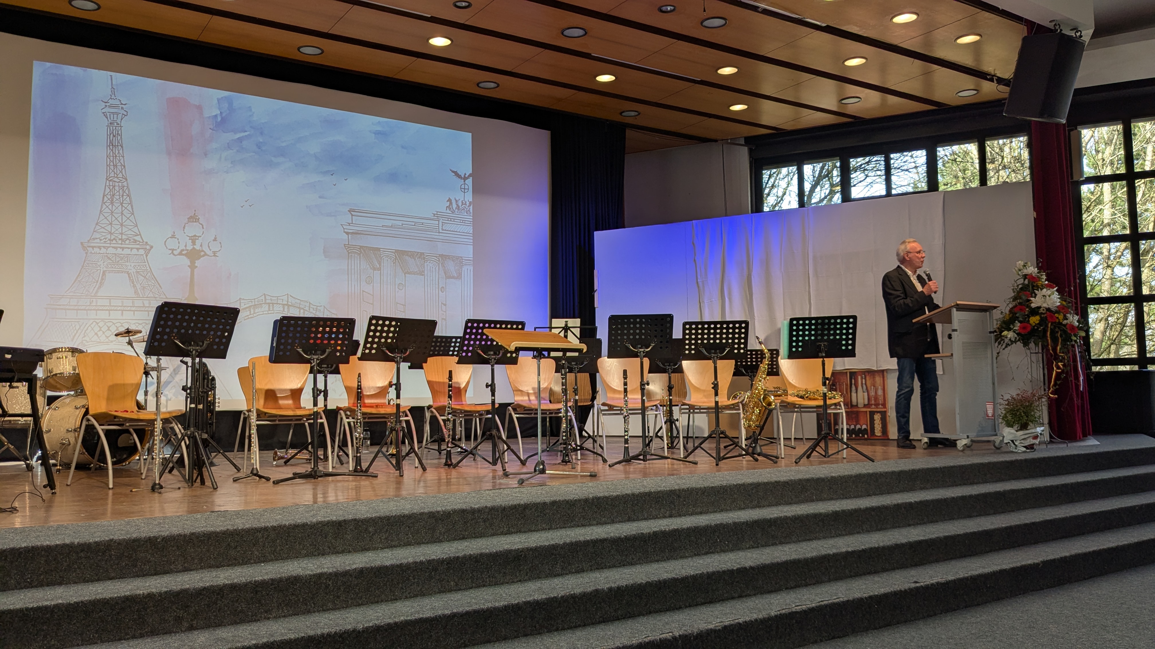 Natürlich gab es musikalisches Rahmenprogramm inclusive der beiden Nationalhymnen, die stehend mitgesungen wurden. Eine Bearbeitung der Europahymne spiegelte den größeren Rahmen. Außer dem Orchester unter Leitung von Frau Rothkopf spielte Samuel Gerhards am Klavier zwei kleine Walzerimprovisationen. Im Anschluss konnten alle noch im Foyer der Aula einen kleinen Imbis genießen, der gerne geteilt wurde. Herzlichen Dank allen, die in der Vorbereitung und Durchführung dieser Jubiläumsfeier mitgearbeitet haben, besonders der Fachschaft Französisch des HJK.