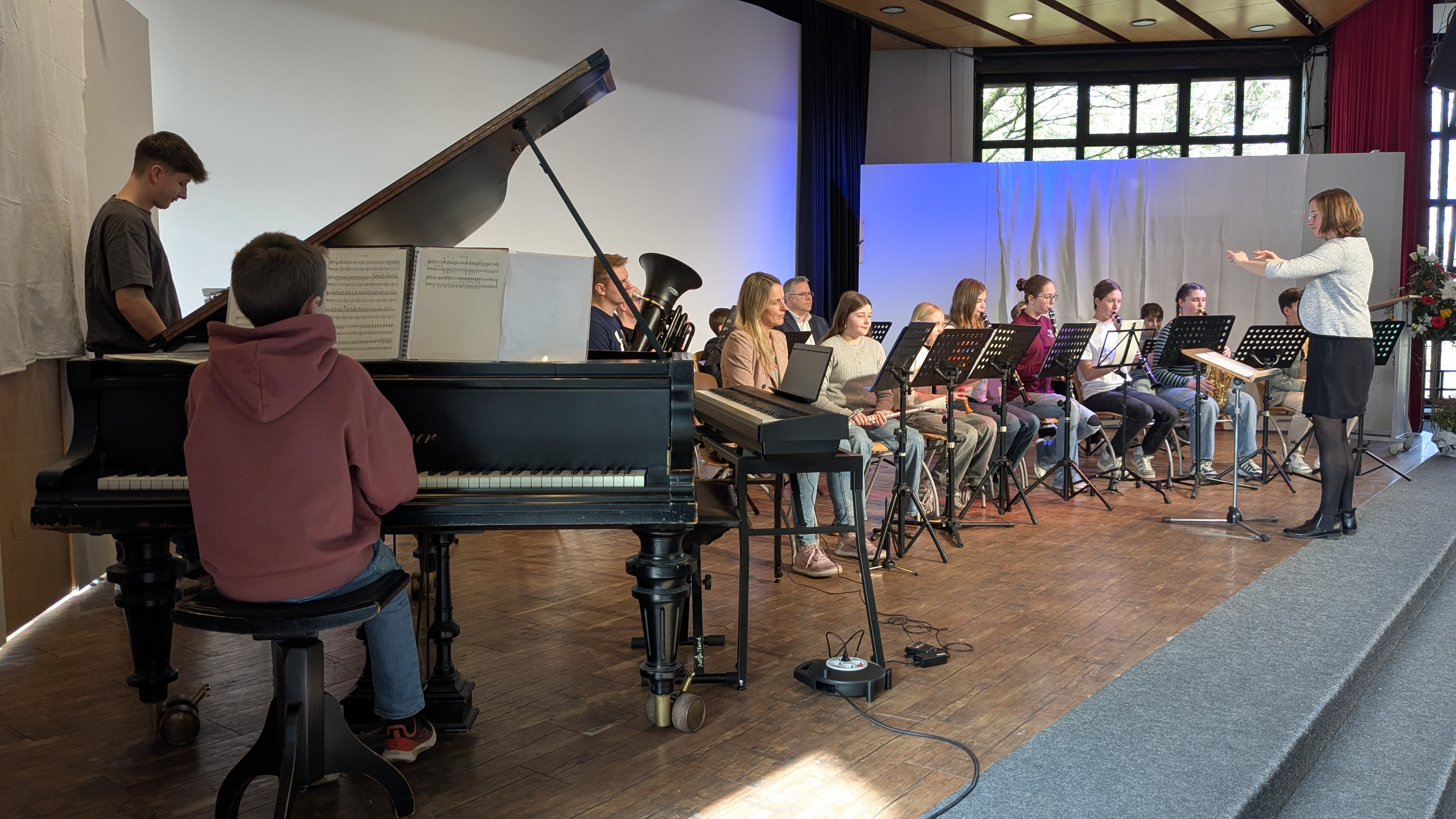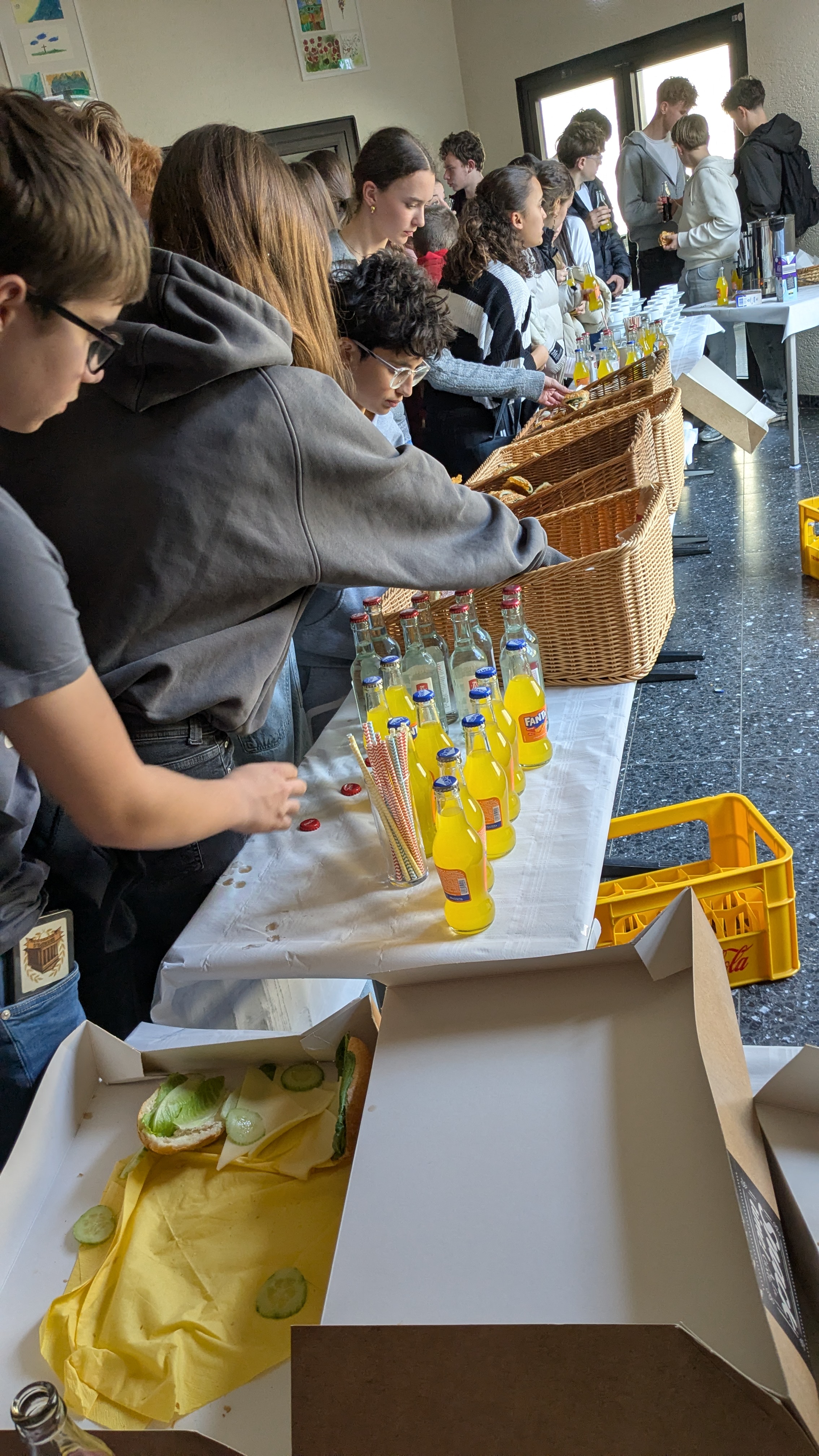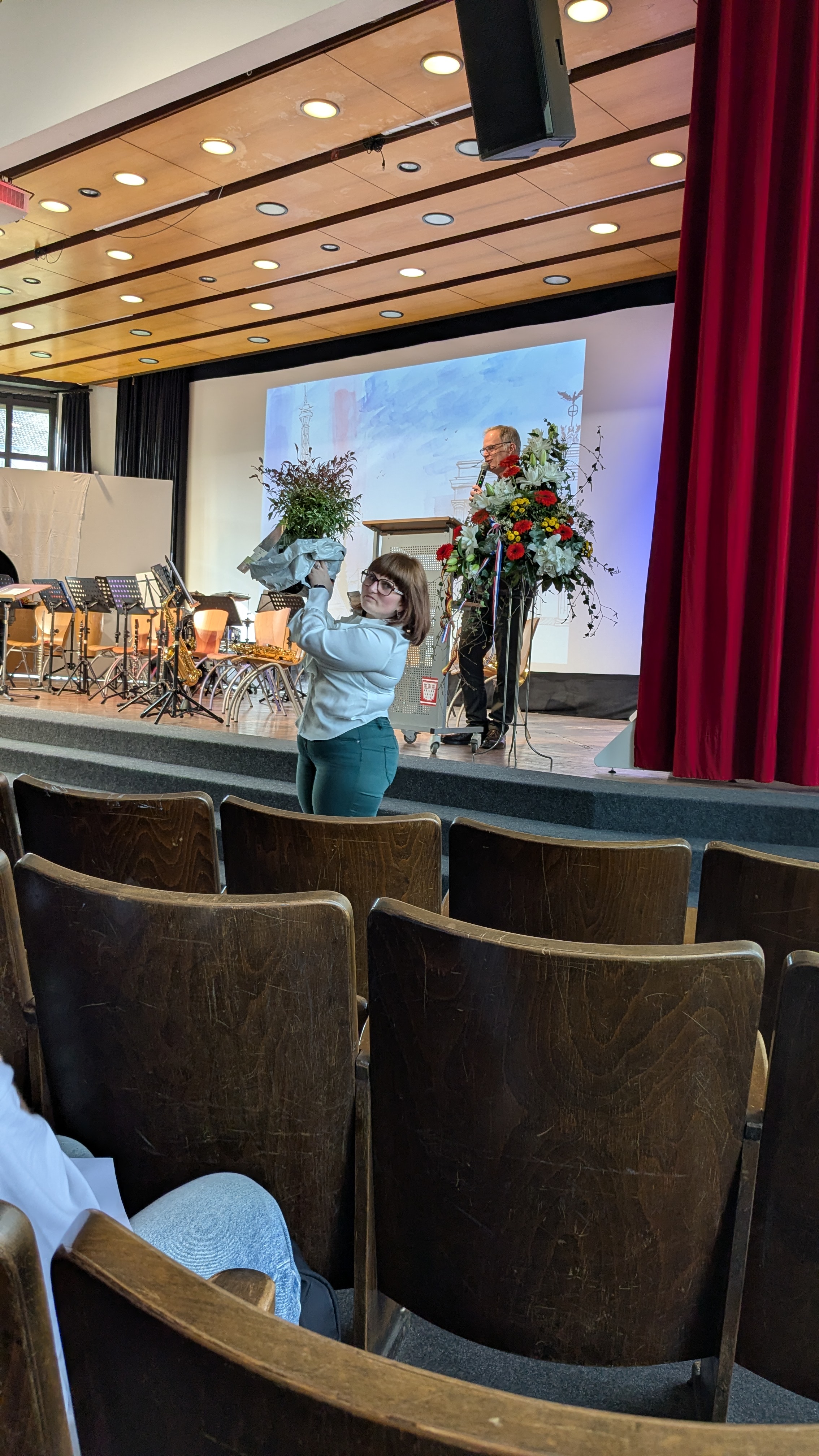 Natürlich gab es musikalisches Rahmenprogramm inclusive der beiden Nationalhymnen, die stehend mitgesungen wurden. Eine Bearbeitung der Europahymne spiegelte den größeren Rahmen. Außer dem Orchester unter Leitung von Frau Rothkopf spielte Samuel Gerhards am Klavier zwei kleine Walzerimprovisationen. Im Anschluss konnten alle noch im Foyer der Aula einen kleinen Imbis genießen, der gerne geteilt wurde. Herzlichen Dank allen, die in der Vorbereitung und Durchführung dieser Jubiläumsfeier mitgearbeitet haben, besonders der Fachschaft Französisch des HJK.