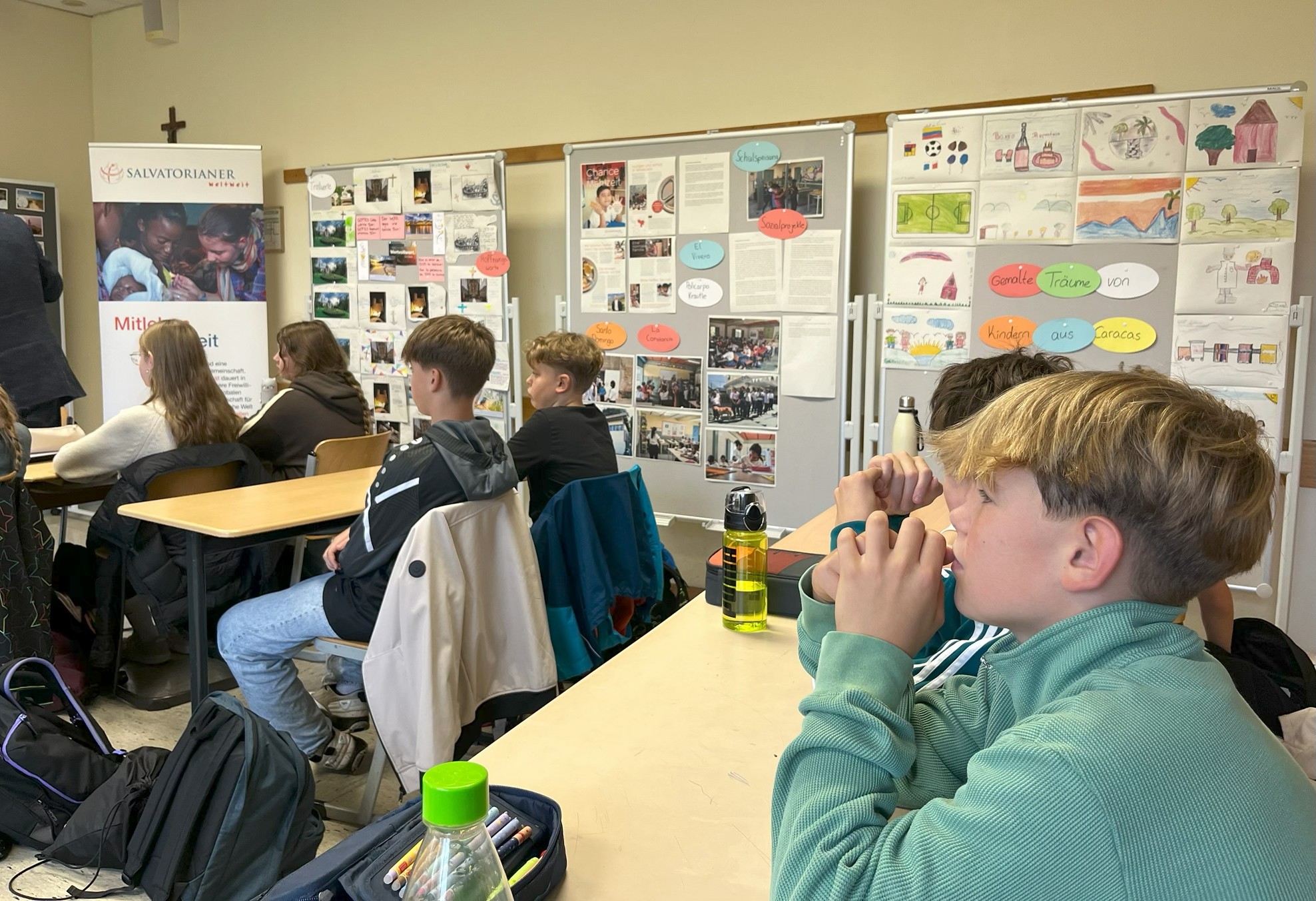 Die Begeg­nun­gen mit Pater Luis in Stein­feld waren sehr beein­dru­ckend. Vor­mit­tags arbei­te­te er mit einer Klas­se sowie einem Ober­stu­fen­kurs in der Schu­le in Work­shops, wo sich die Men­schen bei­der sehr unter­schied­li­cher Wel­ten ken­nen­ler­nen und aus­tau­schen durf­ten. Der Stein­fel­der Schul­ent­wick­lungs­ko­or­di­na­tor Micha­el Schmitz lei­te­te die­se Work­shops. Schmitz: „Wir waren sehr ange­tan, mit wel­chem per­sön­li­chen Enga­ge­ment die Sal­va­to­ria­ner und ins­be­son­de­re Pater Luis in einem so armen Teil der Welt so viel Gutes bewir­ken. Sein Kom­men gibt unse­ren Maß­nah­men nun ein Gesicht.“ In der Tat waren die Stein­fel­der Schü­ler sehr beein­druckt, sie löcher­ten den Pater regel­recht mit ihren Fra­gen.
