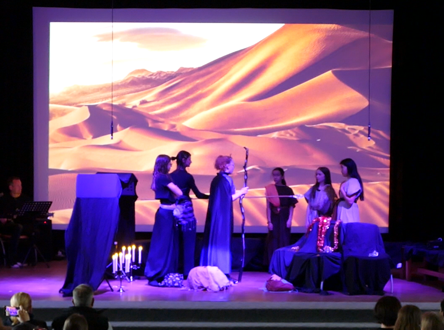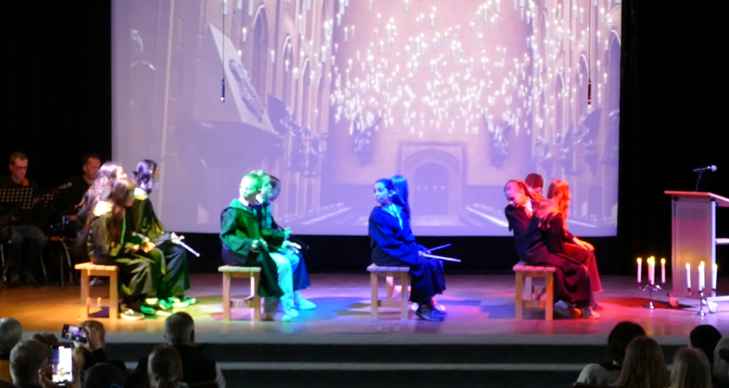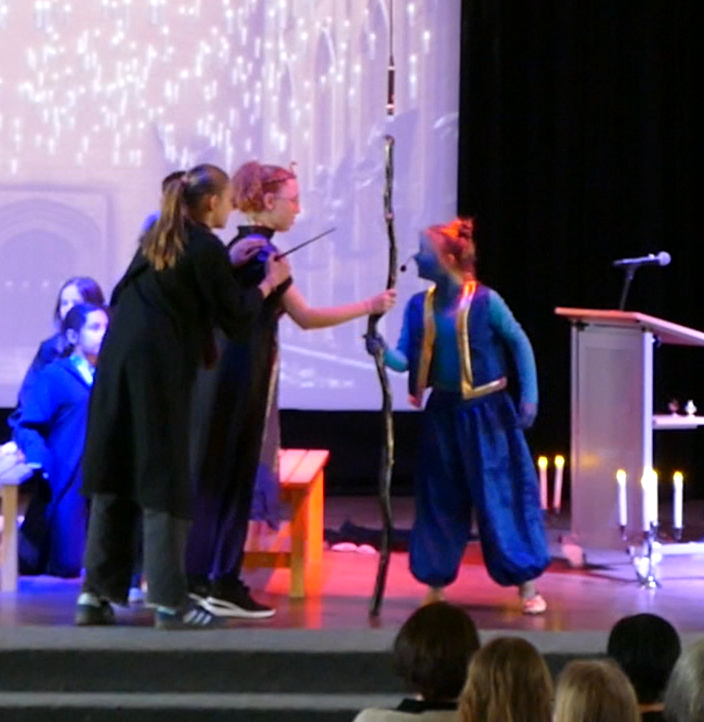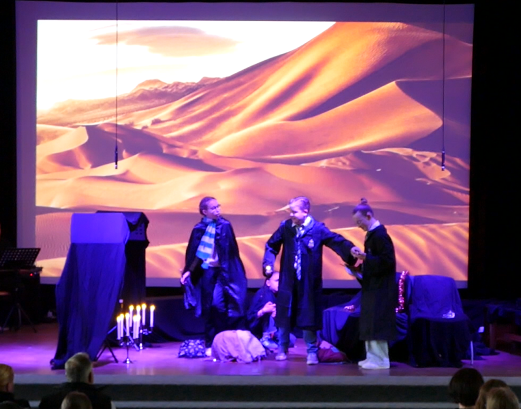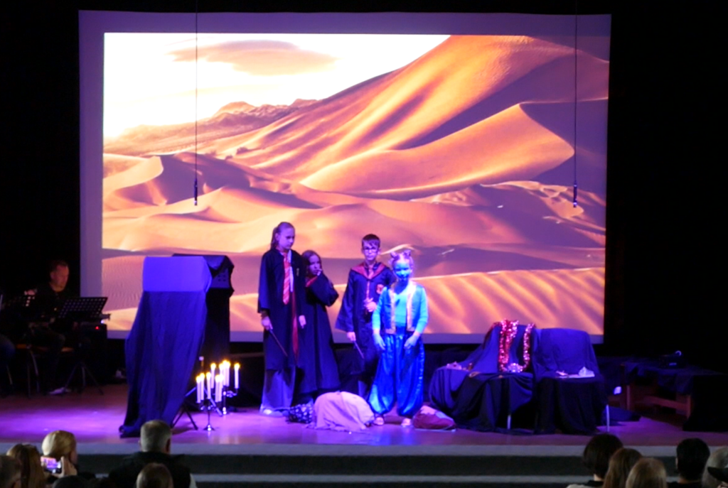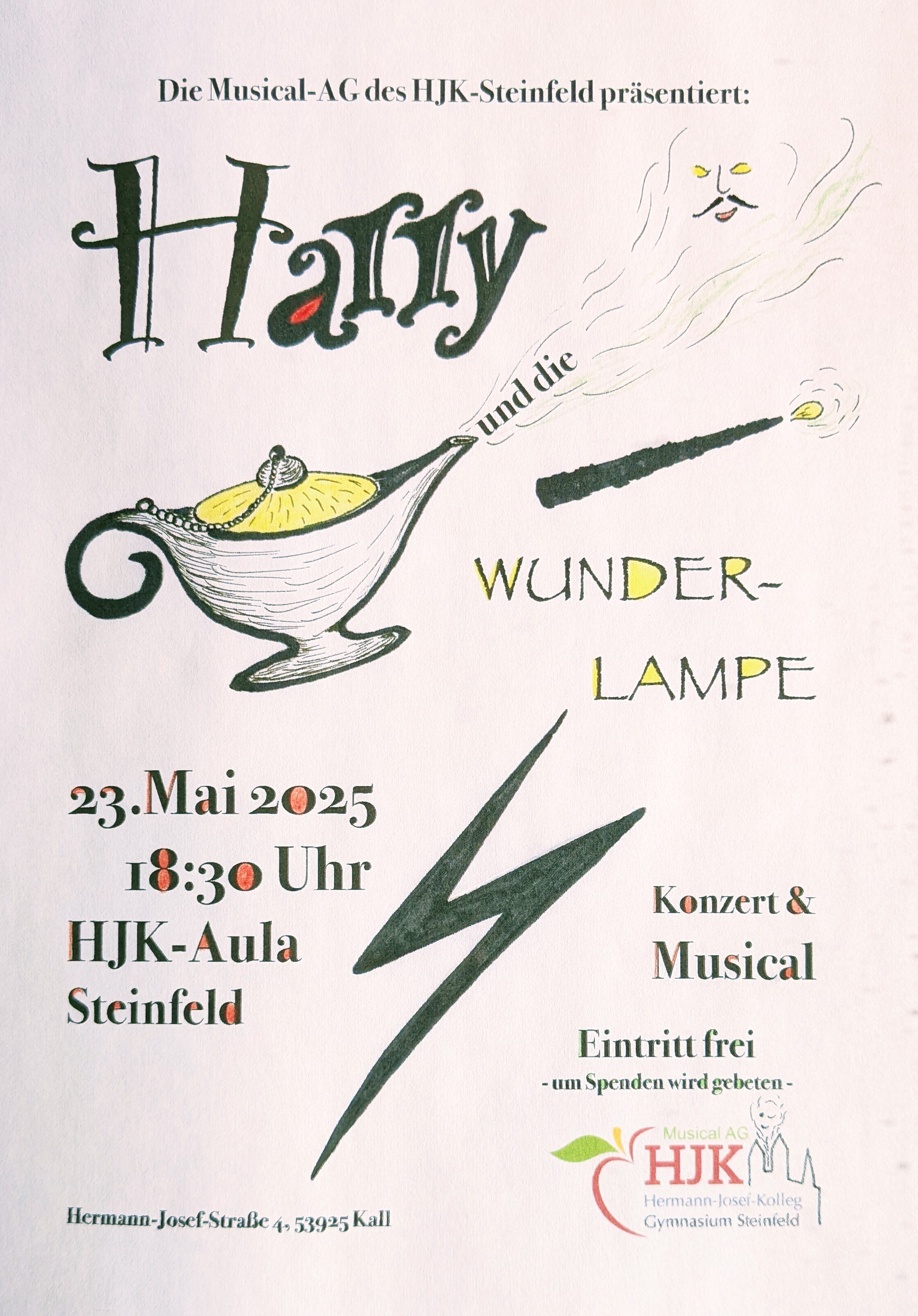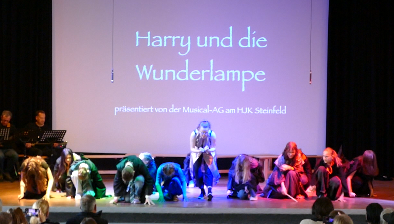 Am Freitag 23.5.2025 um 18:30 Uhr führten wir nach fast einem Jahr Konzept- und Probenarbeit unser Musical auf, ergänzt und bereichert durch einige konzertante Musikauftritte. “Lassen Sie sich von der Musik gerade so begeistern wie von der Zauberkraft des Lampengeistes und der Zauberer aus Hogwarts, die dem nicht minder magischen Djafar gegenüber treten müssen.”, so hieß es in der Einladung. Die Musical-AG unter Leitung von Frau Pfingstmann und Emily Marx (EF) freute sich über viele Zuschauer, die gerne der Geschichte folgten. Ein wenig mehr dazu gab es im Programm. Zuvor gab es vier Lieder vom Instrumentalkreis der Klassen 5. Alle spielten wechselnde Instrumente, wobei jeweils einer aus der Gruppe am Klavier die Führung übernahm. Danach präsentierten Frau Rothkopf und Herr Decker ein Duett von Jasmin und Aladdin, das nicht nur sehr schön klang sondern auch prima auf das Musical hinführte.