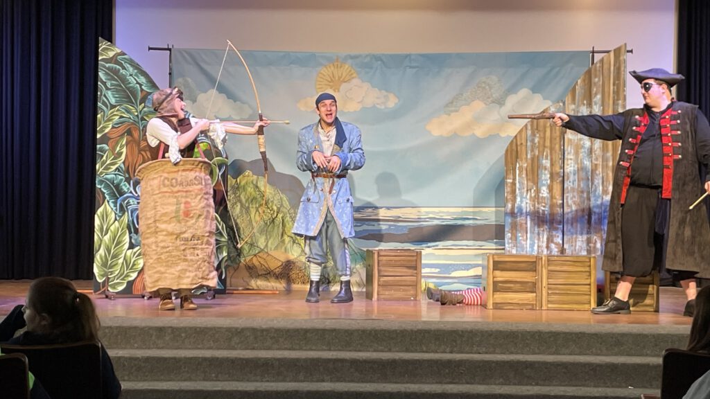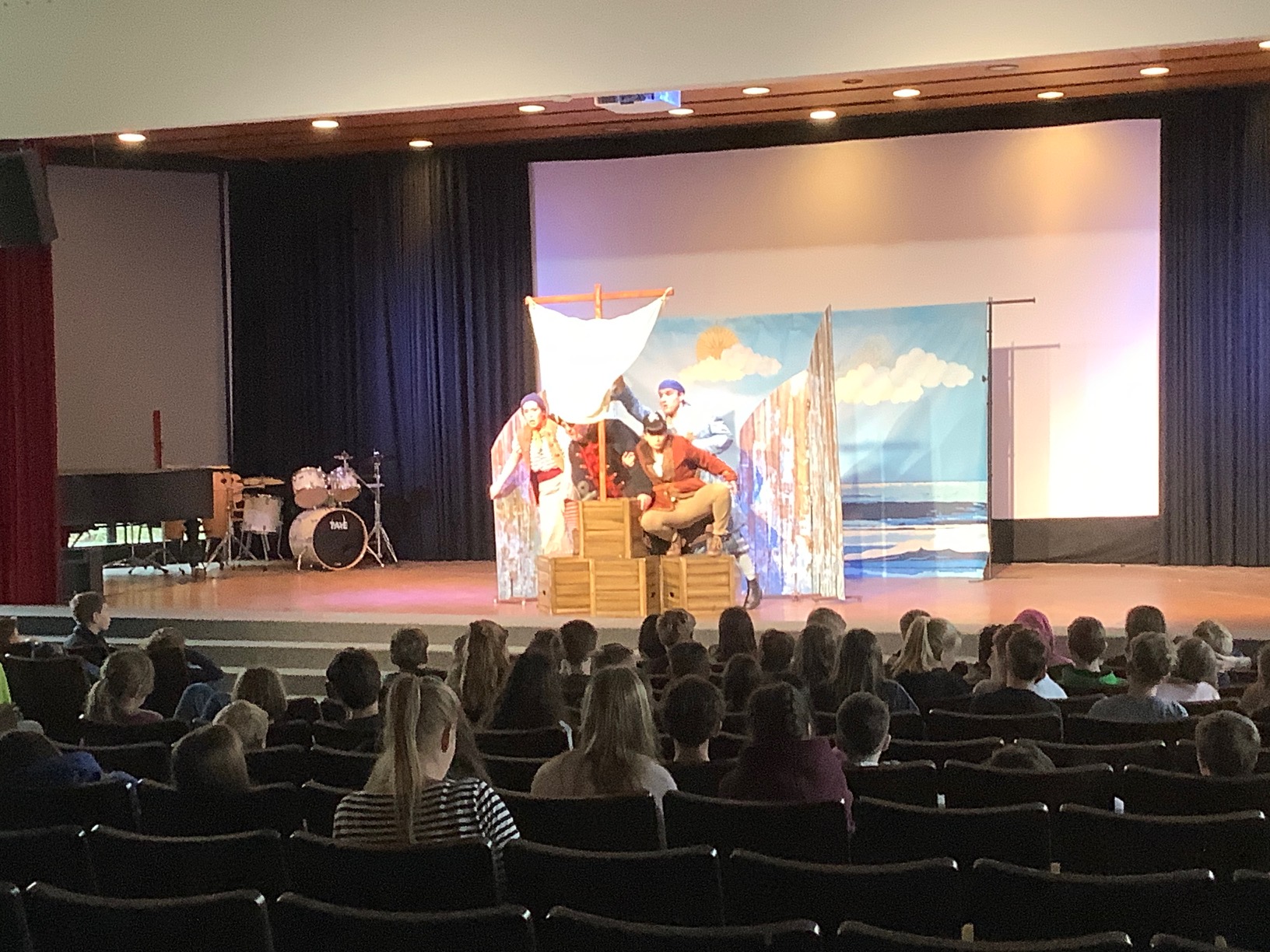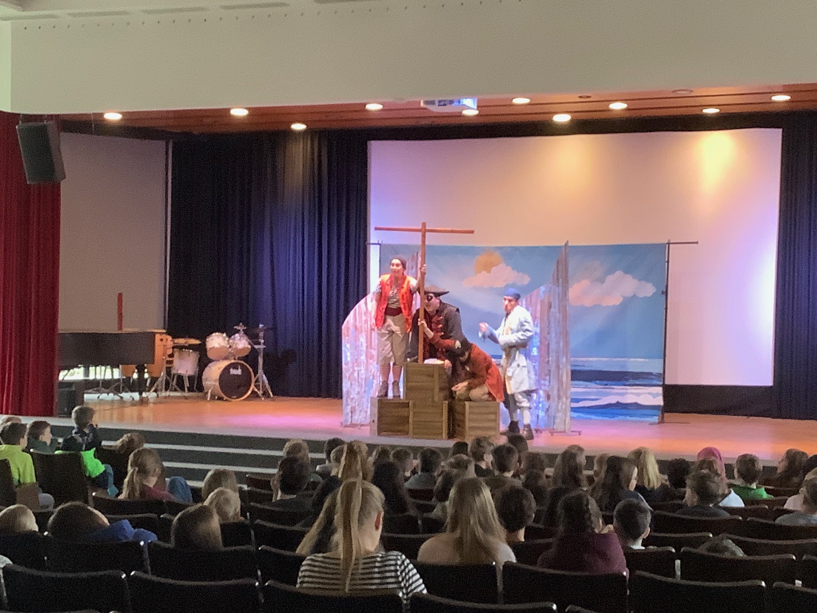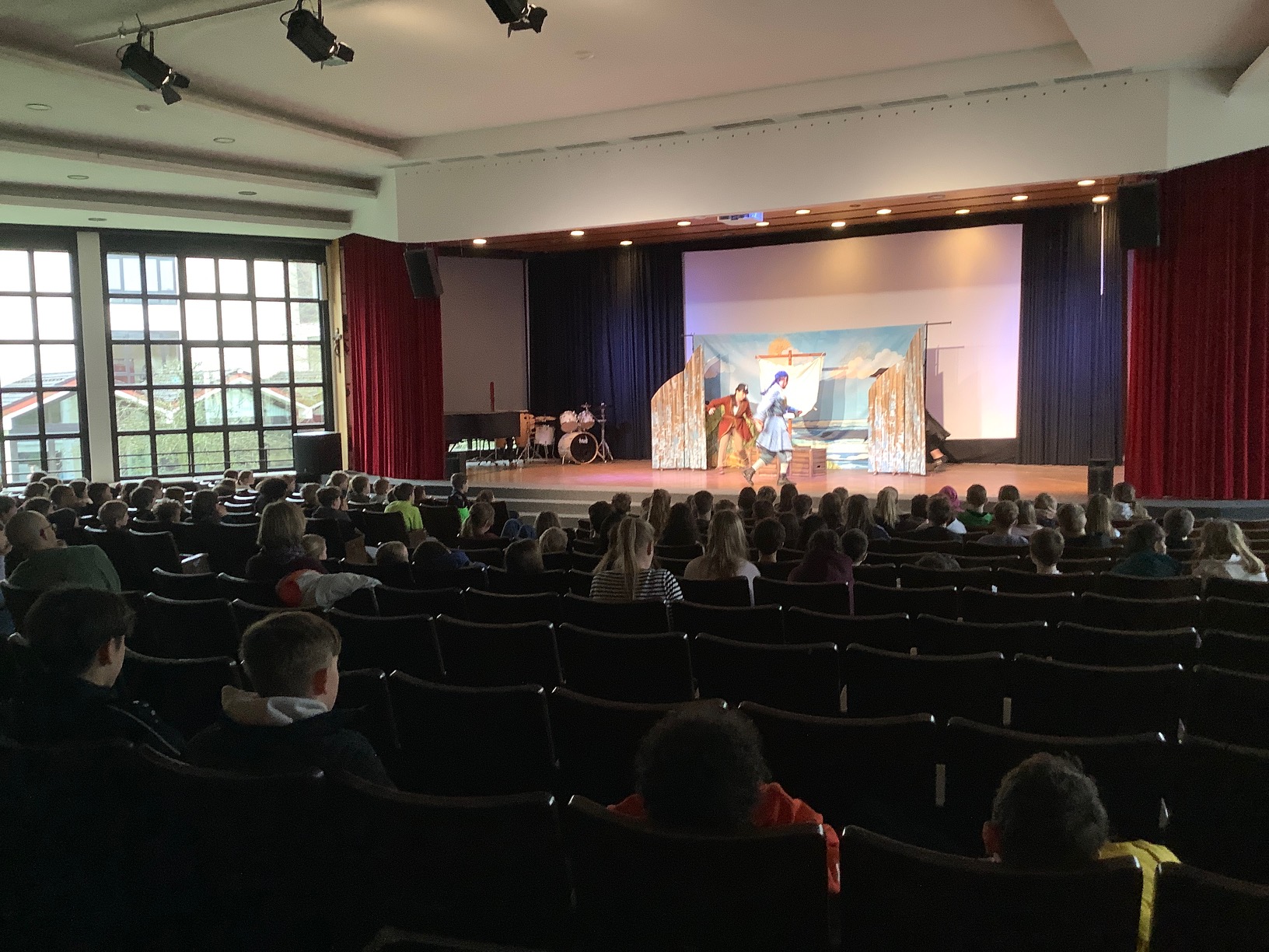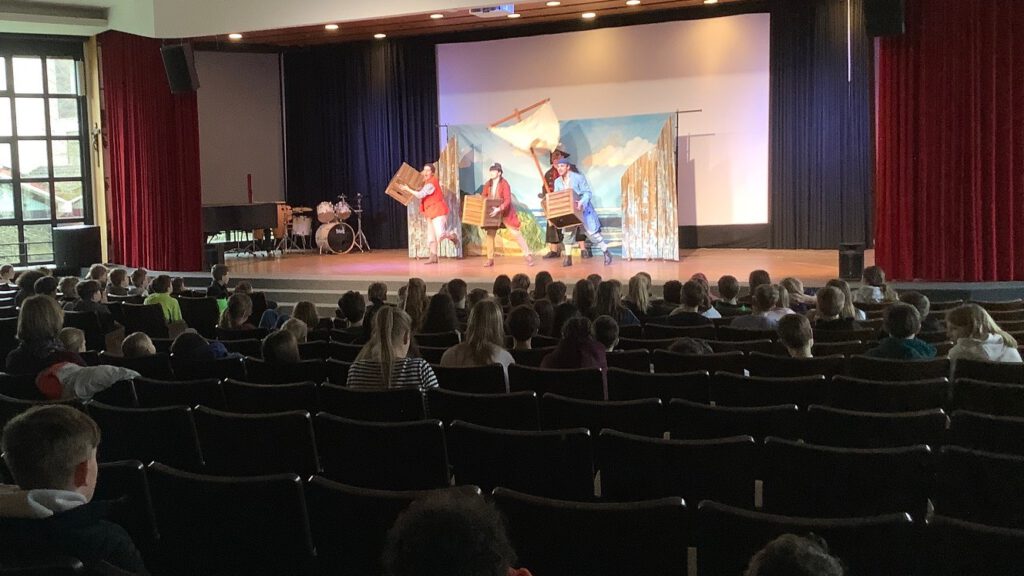 Trotz mancher sprachlichen Herausforderung, gerade für die Stufe 5, konnten die Kinder dank der deutlichen Körpersprache der Schauspieler und der einfachen Handlung dem Treiben auf der Bühne fasziniert folgen. Auch das intensive Einbeziehen der Kinder durch Mitmachmöglichkeiten beim Entführen eines armen Schafhirten auf ein Piratenschiff, sorgte für viel Abwechslung und hielt die Kinder über die Zeit hinweg „auf Kurs“.